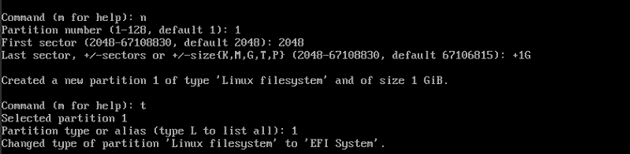 - Change the partition type to EFI System Partition by typing t, then selecting 1 for the partition number and 1 for the EFI System Partition type.